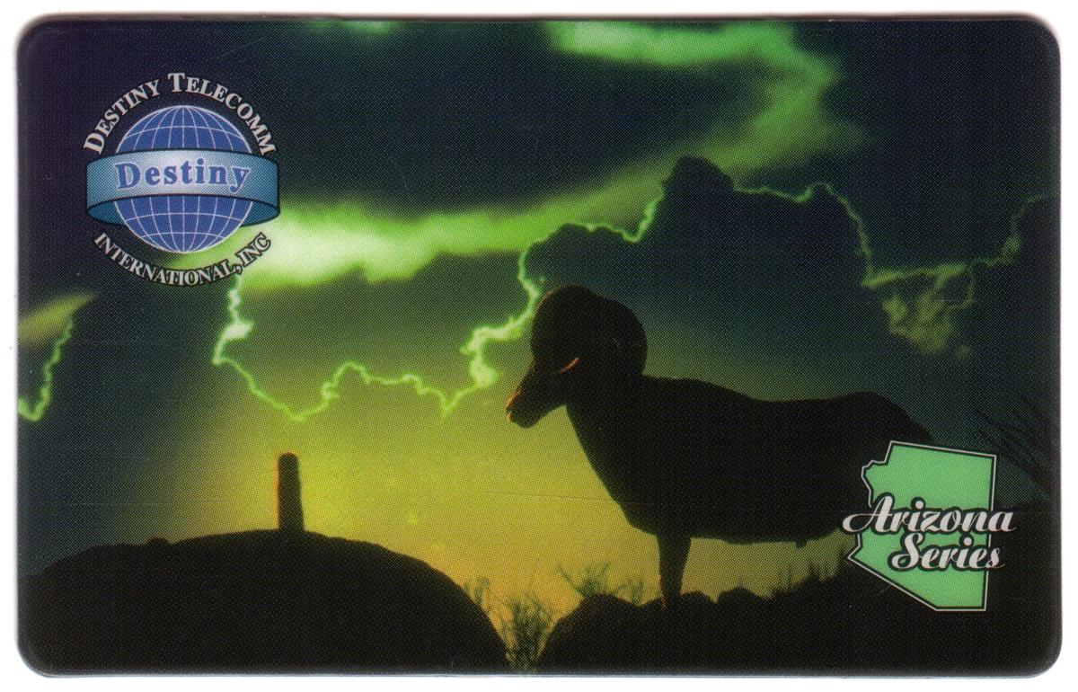 The card belongs to the American States Series, specifically highlighting Arizona. It is issued by Destiny Telecomm, whose logo appears on the card. The word "americana" appears along the top portion of the card, linking it to themes of U.S. heritage and nature. The card’s design emphasizes both the natural beauty of Arizona’s desert environment and its iconic animal, the bighorn ram.