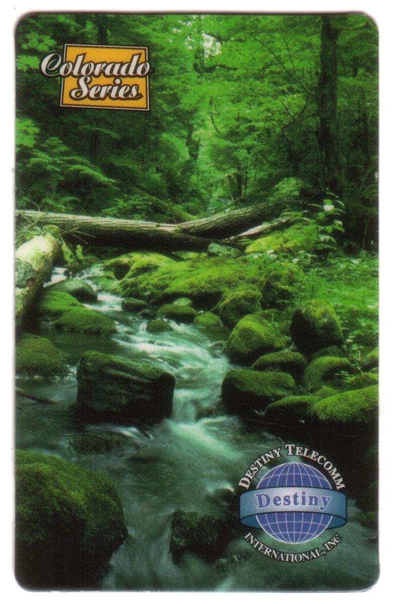 The card includes the branding "Destiny Telecomm," indicating the telecommunications company associated with this phone card. The word “America” and “American States Series” are also present, reinforcing the theme focused on various U.S. states. The card’s design employs natural colors with a strong emphasis on green and blue hues, capturing the tranquil atmosphere of a forest landscape.