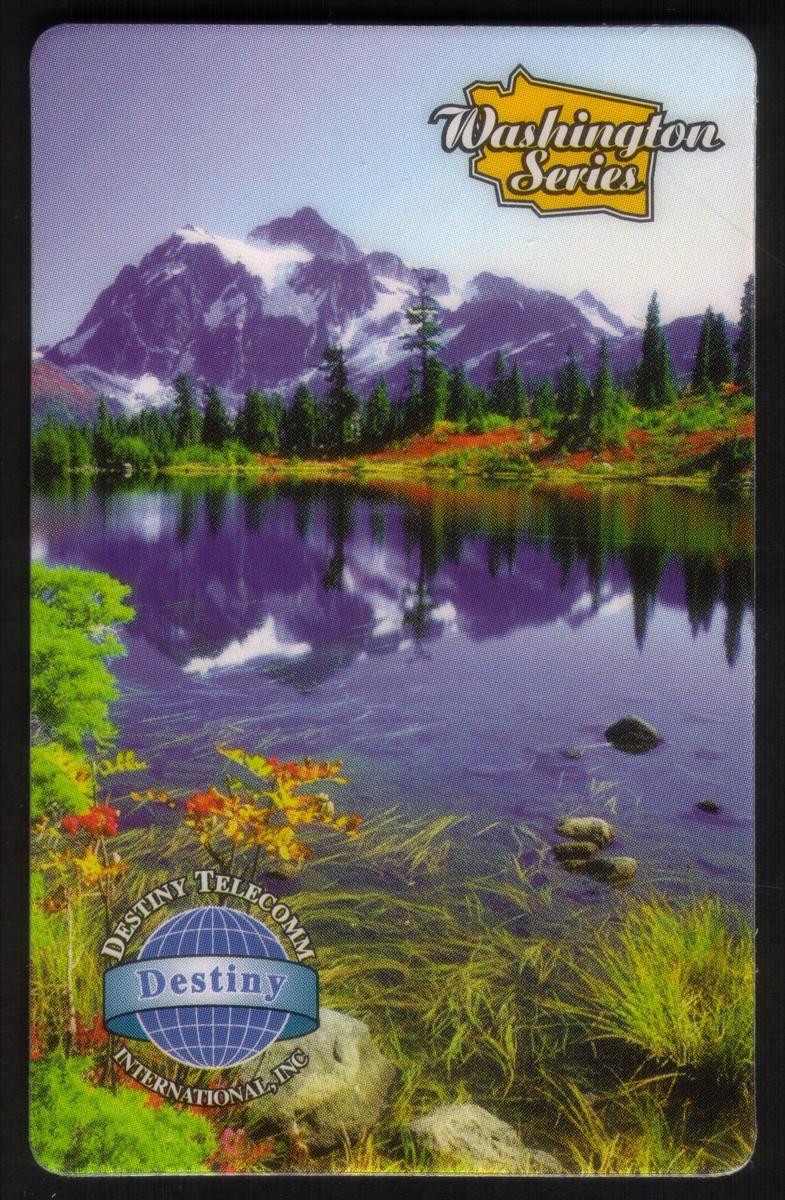 This collectible phone card from Destiny Telecomm features an image representing Washington State, part of the Americana American States Series. The design is vertical and showcases a scenic view encompassing both mountainous terrain and a lake. The image captures a clear, natural environment with a prominent mountain in the background and the calm lake in the foreground. The card’s layout is clean, with the central image framed neatly.