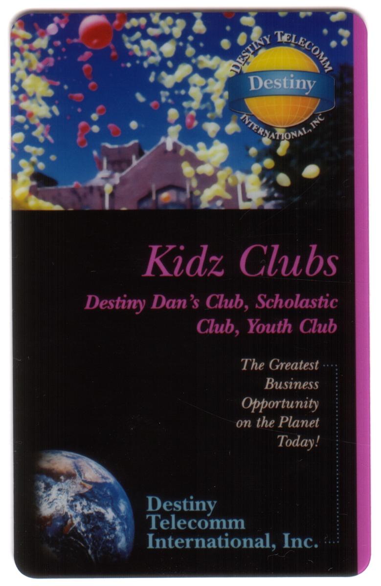 This collectible phone card features artwork related to children's clubs, specifically highlighting Destiny Dan's, Scholastic Club, and Youth Club. The design presents colorful cartoon characters that appeal to kids, reflecting the theme of children's phone cards and clubs. The card displays vibrant, playful illustrations suitable for a younger audience.