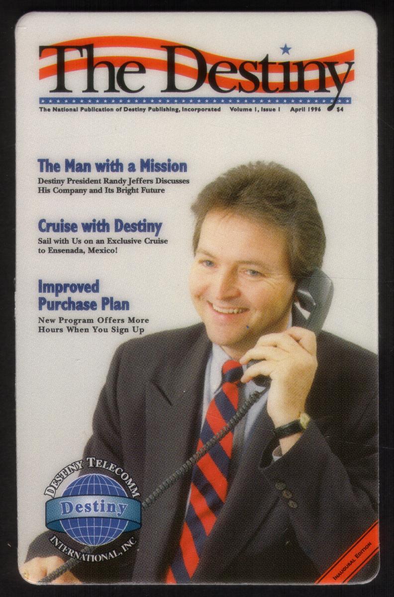 The design is simple yet effective in portraying its promotional marketing theme centered on telephones and telecommunication services. The card’s focus on the individual using a telephone symbolizes communication and connection, fitting the context of the Destiny Telecomm brand and its promotional messaging. The overall presentation is neat and professional, targeting collectors and users interested in phone cards tied to telecommunication promotions.