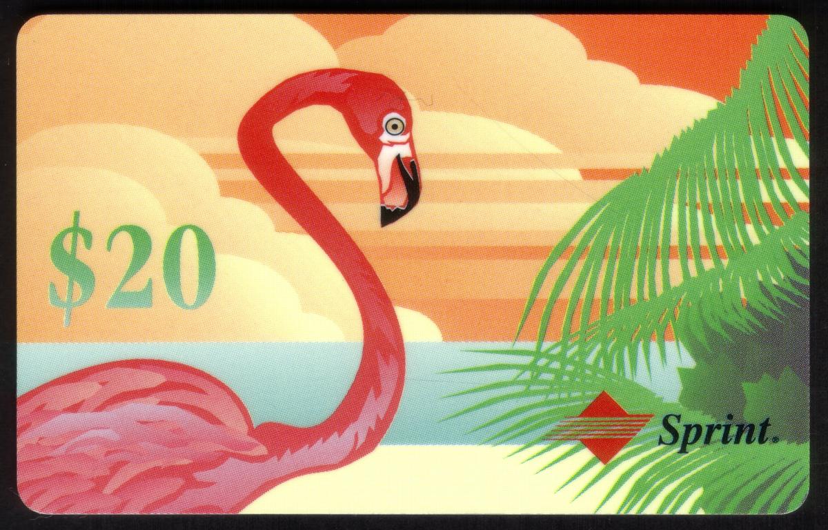 On the right side of the card, green palm fronds frame the scene, enhancing the tropical atmosphere. The lower right corner displays the Sprint logo in black text accompanied by a red diamond graphic. The denomination $20 is printed in large green numbers on the upper left corner of the card, indicating its value.