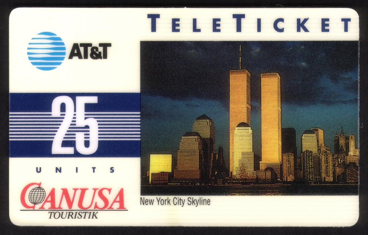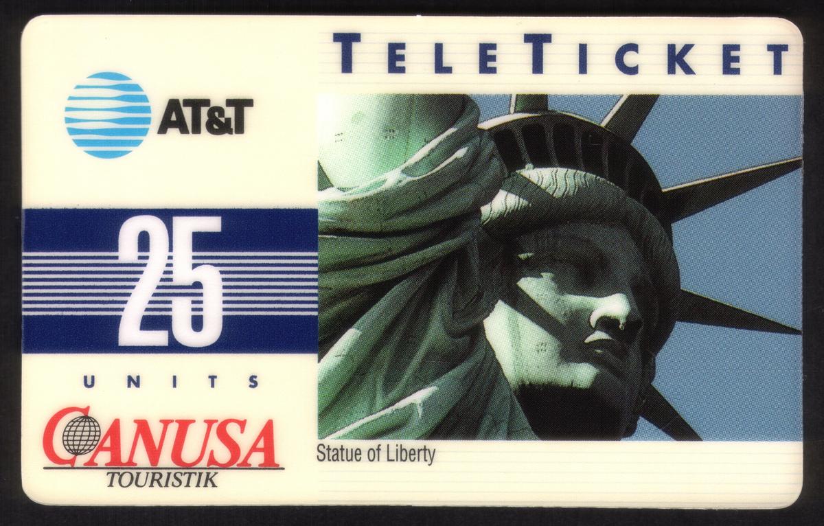 Set of four AT&T TELE TICKET cards featuring Americana landmarks: NYC skyline, Statue of Liberty, Bald Eagle, and Golden Gate Bridge, each valued at 25 units. |