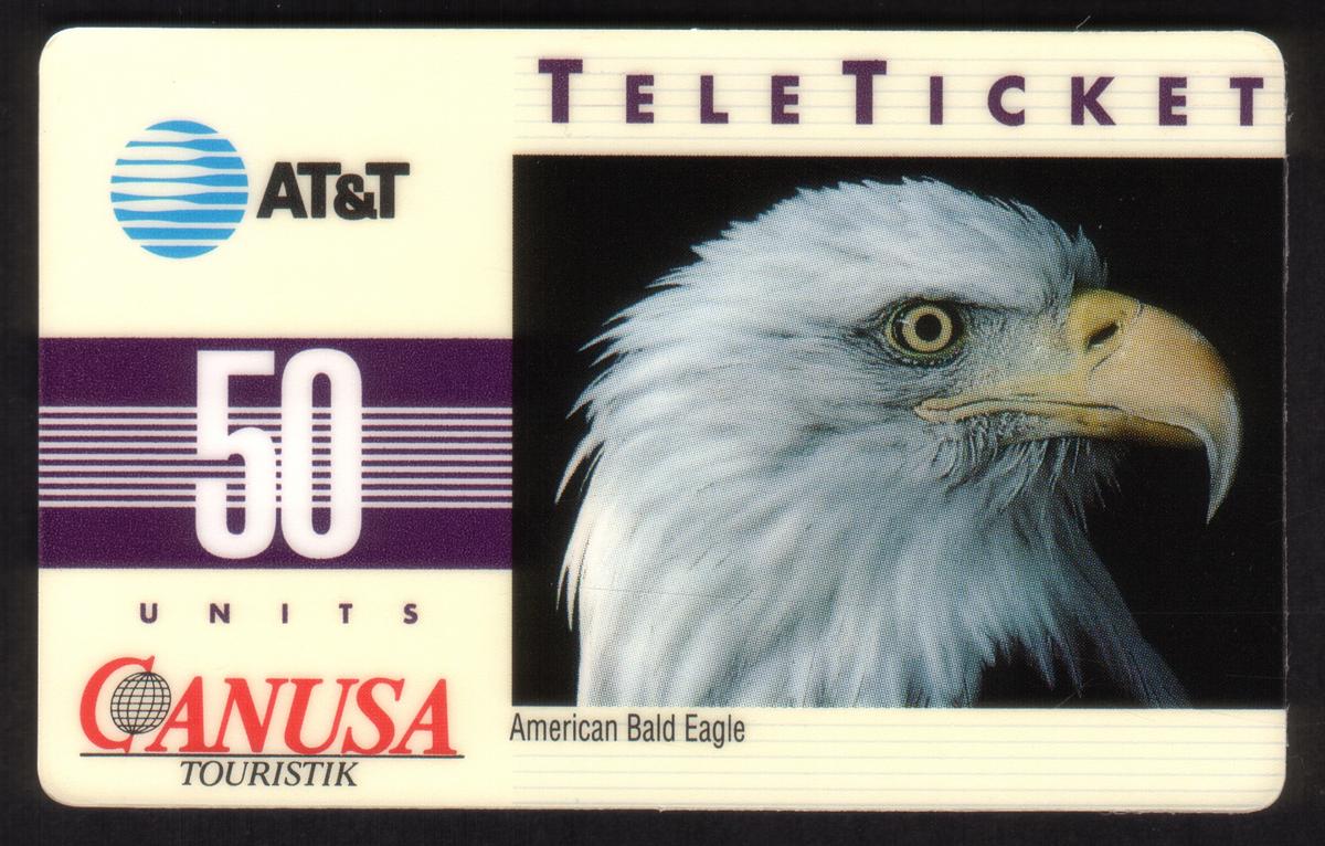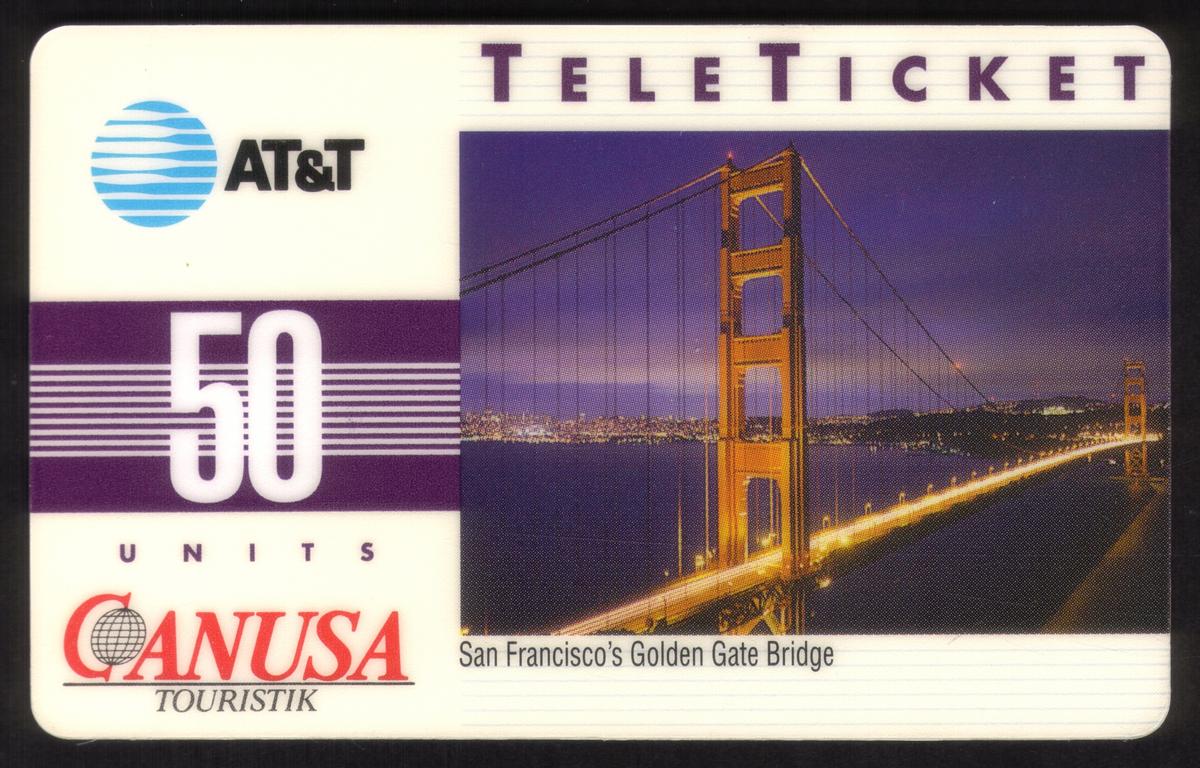 This set of four AT&T Teleticket collectible phone cards features iconic American landmarks and symbols. Each card has a value of 50 units and displays the CANUSA TOURISTIK logo prominently in red. The cards are part of a scenic Americana series highlighting famous U.S. imagery.