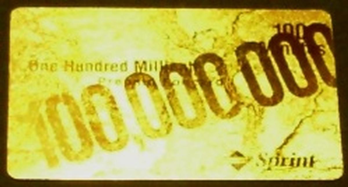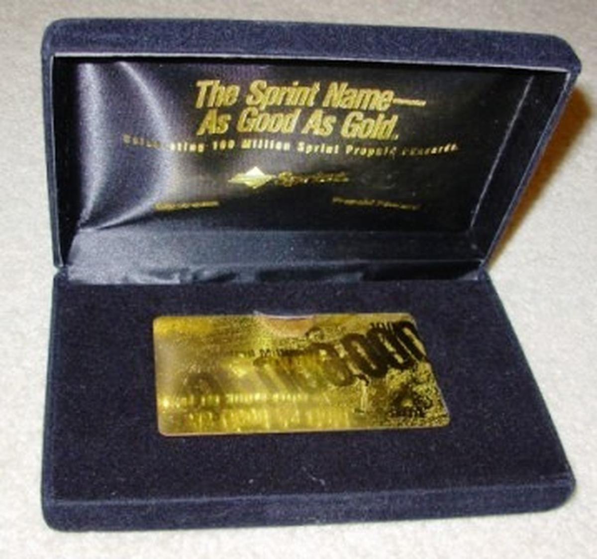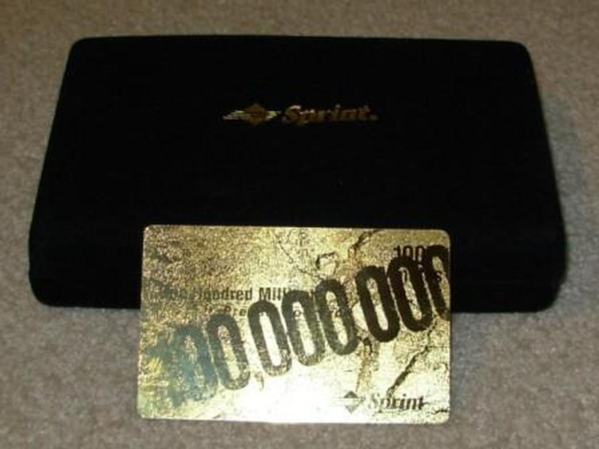 The card's design emphasizes the achievement of reaching one hundred million prepaid foncards, using gold coloring to highlight its special edition status. The entire front surface of the card exhibits a metallic gold texture with faint, irregular markings that contribute to its distinct appearance. This item is a rare marketing and advertising promotion highlighting Sprint's prepaid foncard success and serves as a significant collectible.