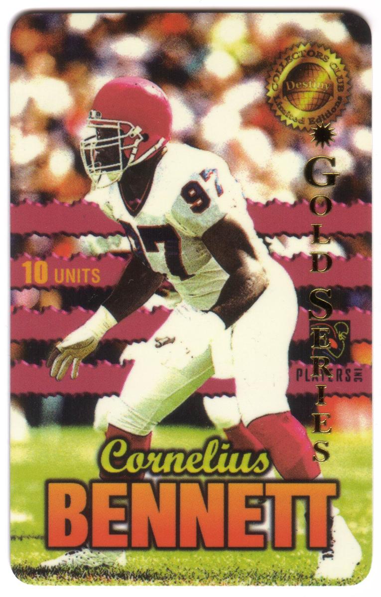 This collectible card features Cornelius Bennett, a linebacker for the Atlanta Falcons, wearing his team uniform with the number 4 prominently displayed. The card highlights Bennett as one of the "Men of Destiny" and is marked as a "10u GOLD" edition. The design includes a football-themed background with multiple football graphics framing the central image of Bennett. The name "Cornelius Bennett LB Atlanta" is clearly printed on the card.