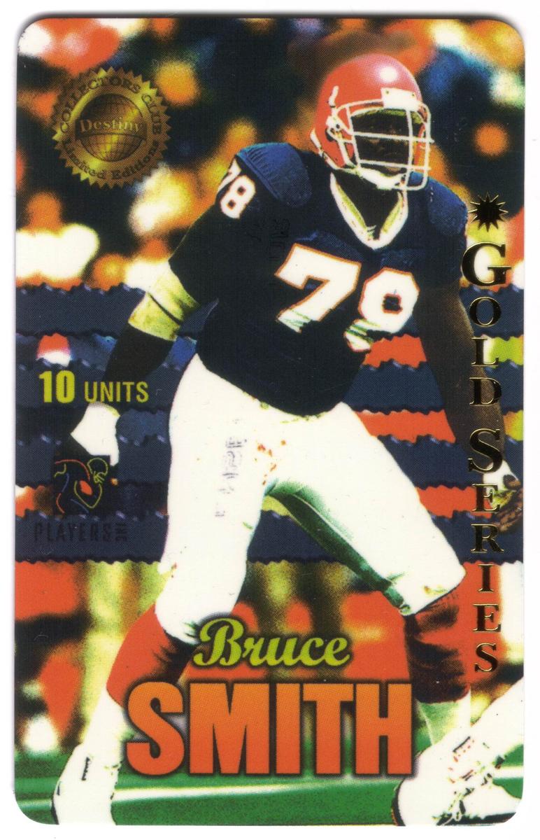 The card is marked as "Used" and is associated with Destiny Telecomm, suggesting it is a collectible phone card issued under this telecommunications brand. The design includes the NFL and football themes, aligning with the notable career of Bruce Smith in professional football. The card's imagery and text focus on celebrating Bruce Smith's role and legacy within the sport and the Buffalo Bills organization.