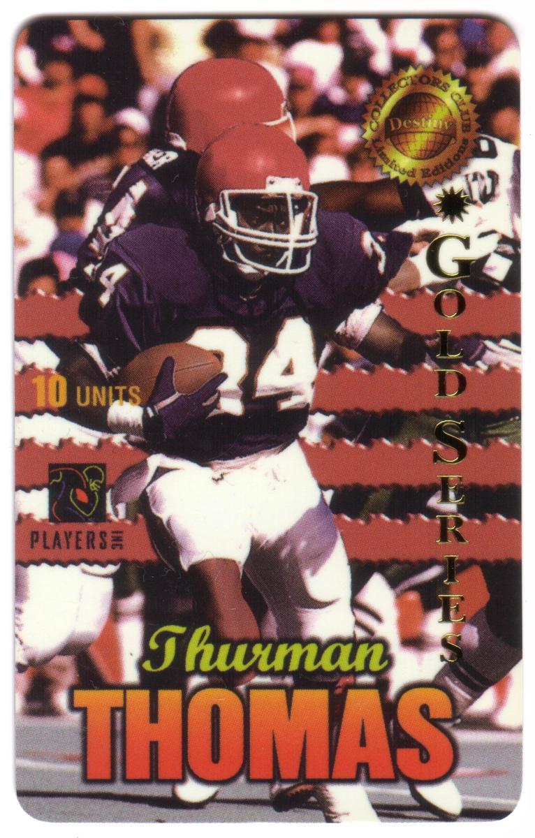 This collectible phone card features Thurman Thomas, a former running back for the Buffalo Bills in the National Football League (NFL). The card prominently displays an image of Thurman Thomas in his full football uniform, including his helmet and jersey. The number "12" is visible on the lower left portion of the card, indicating it is number 12 out of a limited edition of 100 cards. The card is part of the "Men of Destiny" series, denoted as "10u GOLD," and it highlights Thurman Thomas’s position as RB (running back) with the Buffalo Bills. The card includes the NFL logo and the Buffalo Bills’ team branding.