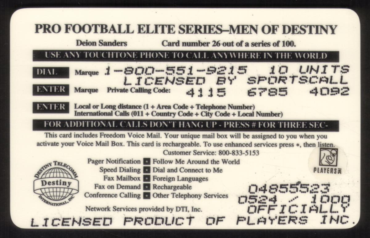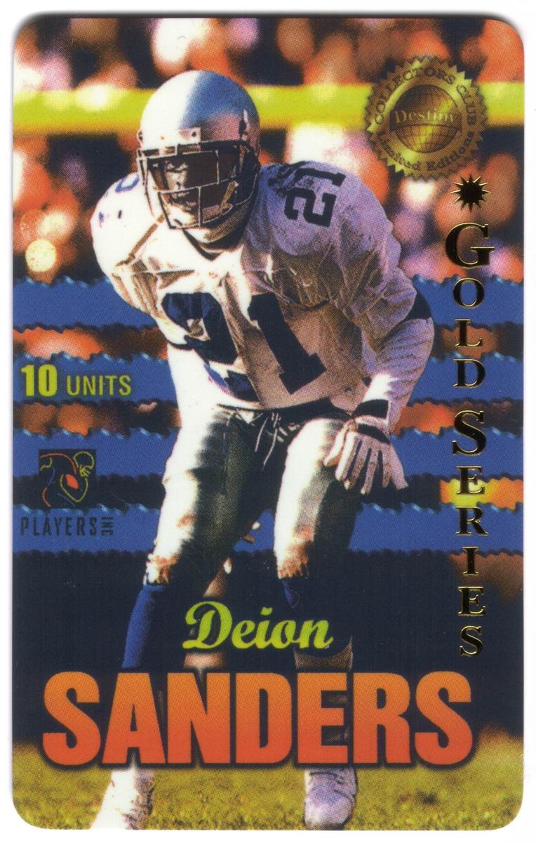 This item is part of the National Football League collectible cards featuring football players. Deion Sanders is noted as a cornerback and wide receiver ("CB-WR") for Dallas. The card is a limited edition collectible associated with football and the NFL.