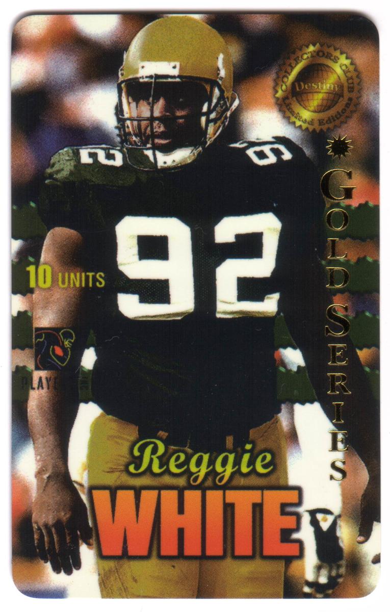 This collectible card features Reggie White, a defensive end for the Green Bay Packers in the NFL. It honors the "Men of Destiny" series with a designation of 10u GOLD. The card’s design prominently shows Reggie White wearing his Green Bay Packers uniform with his jersey number 92 visible on his front and shoulders. The NFL logo appears on the card, emphasizing its official connection to the National Football League. The Green Bay Packers helmet is displayed alongside White, along with a football graphic that reinforces the sport focus.
