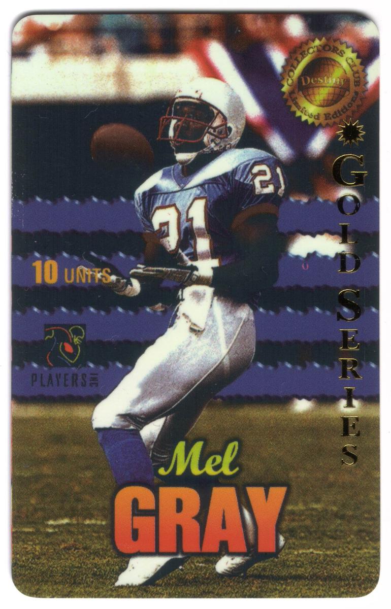 This collectible chip card features Mel Gray, a wide receiver and kick returner (WR-KR) for the Houston football team in the National Football League (NFL). The card is issued by Destiny Telecomm and is numbered 39 out of 100. The card highlights Mel Gray's role as a member of the "Men of Destiny," emphasizing his career in professional football.