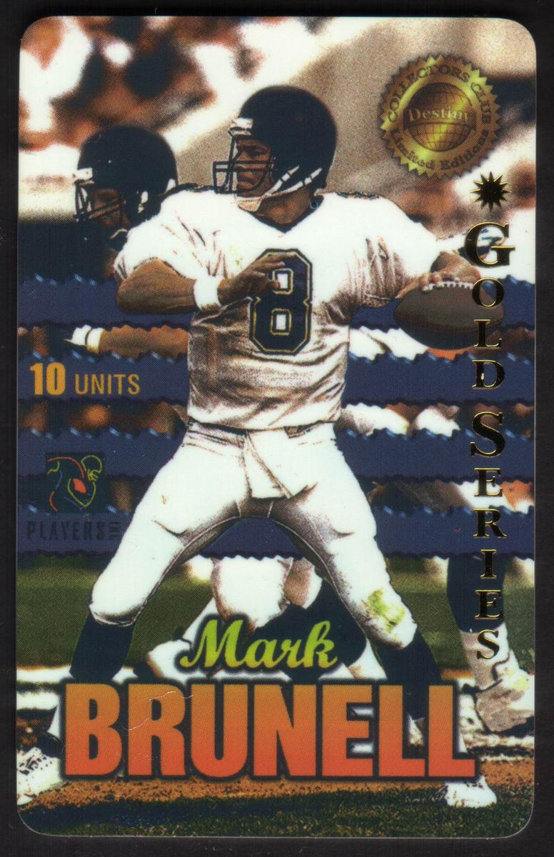 This collectible football card features Mark Brunell, quarterback (QB) for the Jacksonville Jaguars, wearing jersey number 45. Mark Brunell is depicted in full game attire, including the Jaguars’ teal and black uniform. The card highlights the National Football League (NFL) theme, showcasing a dynamic image of Brunell in action.