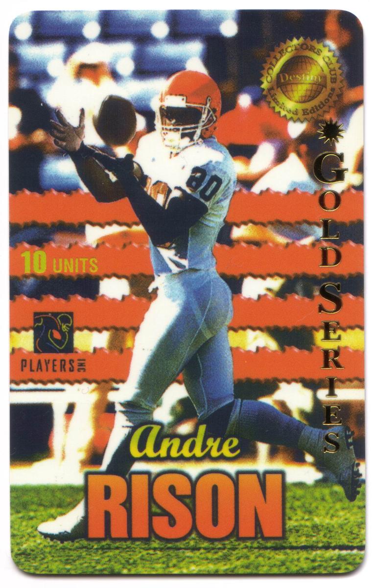 This card is a used collectible item commemorating Andre Rison’s career as a prominent football player in the NFL, specifically marking his time with the Jacksonville Jaguars. It appeals to collectors of football sports cards, particularly those focused on limited edition and gold series releases.