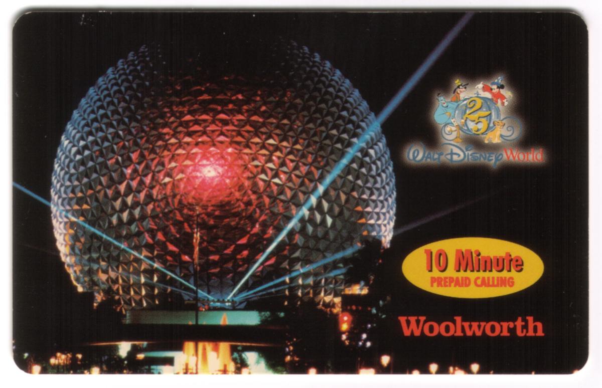 This phone card was issued as part of the Walt Disney World 25th Anniversary commemorative series, produced by Eastman Kodak in 1997. It highlights the theme parks, Florida attractions, and travel experience associated with Walt Disney World while focusing on the celebrated Spaceship Earth attraction at Epcot.