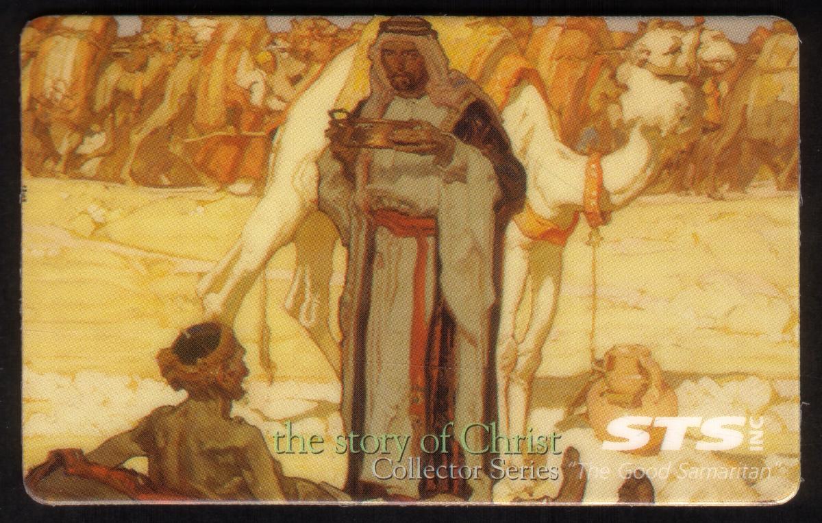 This collectible chip card features the artwork titled "The Good Samaritan," created by Dean Cornwell. The image portrays a biblical scene from the Christian story of the Good Samaritan, an important narrative from the Bible. The artwork emphasizes themes of compassion and spirituality, reflecting Christian religious teachings.