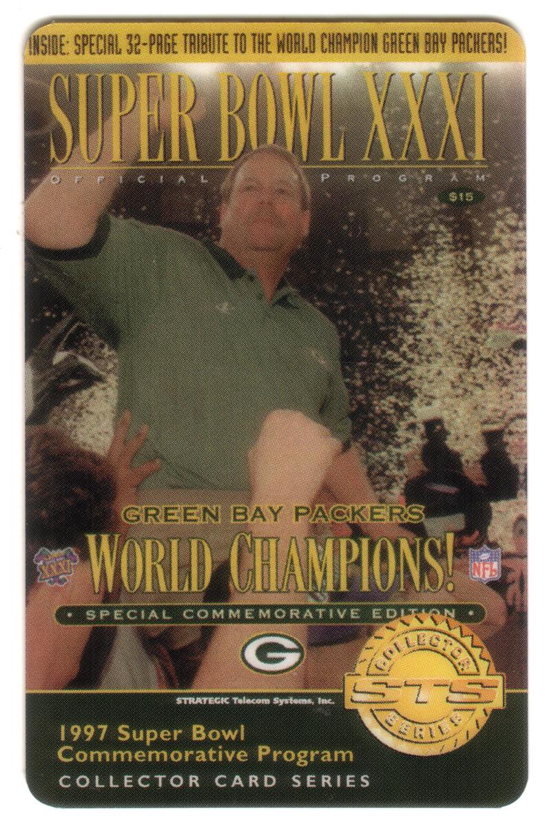 Additional branding includes the name "Strategic Telecom Sys." and the word "WorldCom," integrating corporate associations linked to the card’s issuance. The overall design reflects the prestige of the NFL World Championship and specifically honors the Green Bay Packers’ achievement during the Super Bowl held in 1997. The card is targeted toward collectors interested in football and Super Bowl memorabilia, focusing on the significant legacy of the 1997 Packers team under Coach Mike Holmgren.