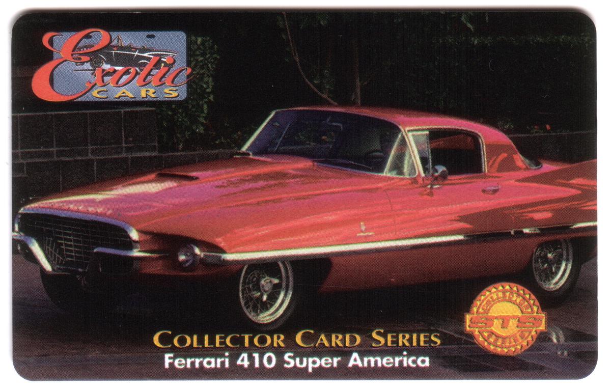 This card is part of a collector series issued by Strategic Telecom Sys. It focuses on the Ferrari 410 Super America, a classic automobile admired for its combination of luxury and performance. The photographic artwork captures the essence of this exotic vehicle, highlighting its aesthetic and engineering excellence.