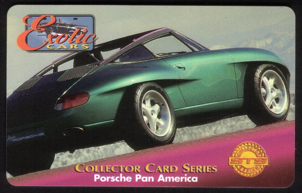 The first card highlights the Porsche Pan America. It displays a side and rear view of this classic automobile, emphasizing its sleek, green body with a soft metallic sheen and smooth curves. The car is positioned at an angle, slightly elevated on a pink pavement-like surface, against a muted gray sky. The logo “Exotic Cars” is printed in the upper left corner in an orange-red script with a stylized car silhouette above it. At the bottom center, the card is labeled “Collector Card Series Porsche Pan America” in gold and white text. A gold circular emblem with a telecom symbol is visible at the lower right corner.