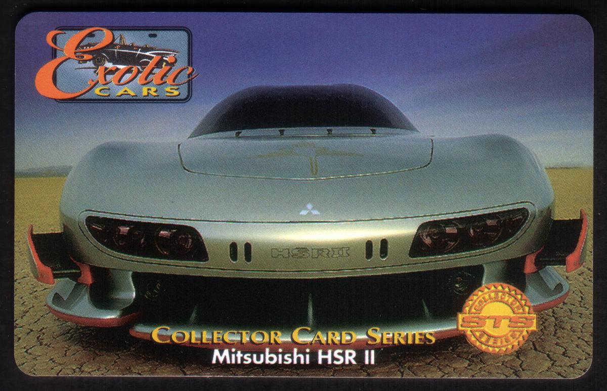 The third card features the Mitsubishi HSR II from a frontal view. The car’s design reflects futuristic styling, with a low profile and a wide stance on a cracked desert floor. The vehicle exhibits a metallic silver-gray paint with black and red aerodynamic accents on the bumpers. The Mitsubishi logo is centered above the front grille. The background shows a dry, barren landscape with a light blue sky. The “Exotic Cars” logo is situated in the top left corner, and the card’s bottom center text states “Collector Card Series Mitsubishi HSR II” in gold and white. The gold circular telecom emblem is visible in the bottom right corner.