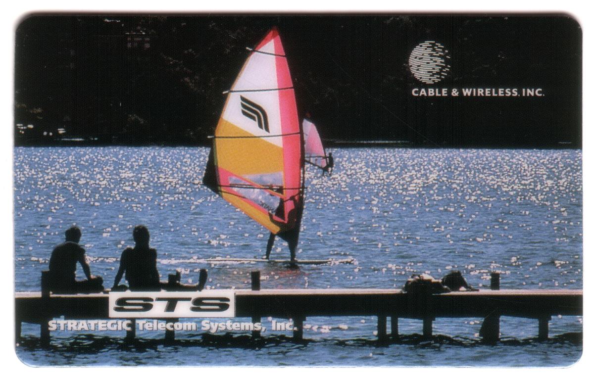 The card is part of the Strategic Telecom Systems (STS) Minneapolis Panorama Collector Series issued in 1996. It prominently includes the logos and branding of Cable & Wireless (C&W), CWI, and the Greater Minneapolis Convention & Visitors Association, reflecting partnerships tied to telecommunications and regional promotion during that time. The text “Panorama Series: Minneapolis: Windsurfing on Lake Calhoun” appears clearly on the card, reinforcing the theme and location of the image.