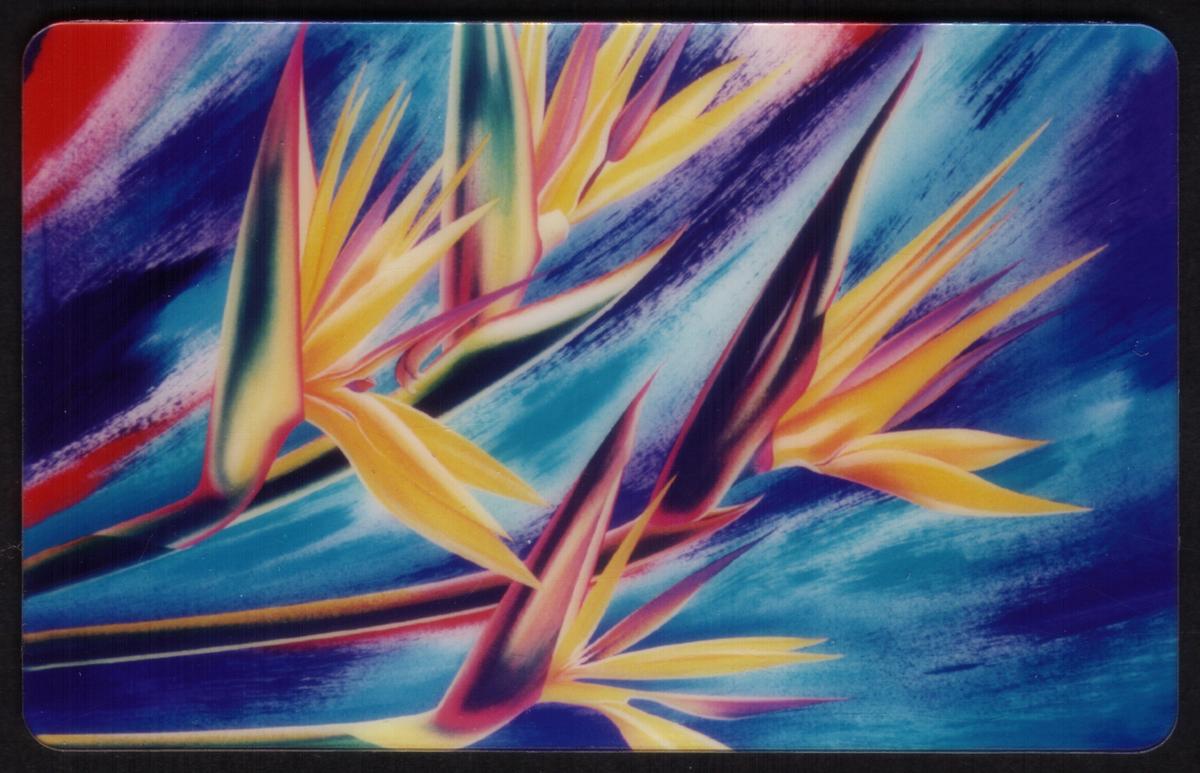 This set of four collectible cards, titled "Flowers: Bird of Paradise, Lilies & Sunflowers," features detailed artistic illustrations of different flowers against vibrant backgrounds. The first card prominently displays an arrangement of Bird of Paradise flowers, characterized by their striking yellow and orange petals with purple accents set against a dynamic blue and white patterned background. The artwork highlights the unique shapes and vivid colors of the Bird of Paradise petals, emphasizing their elegance and exotic appeal.