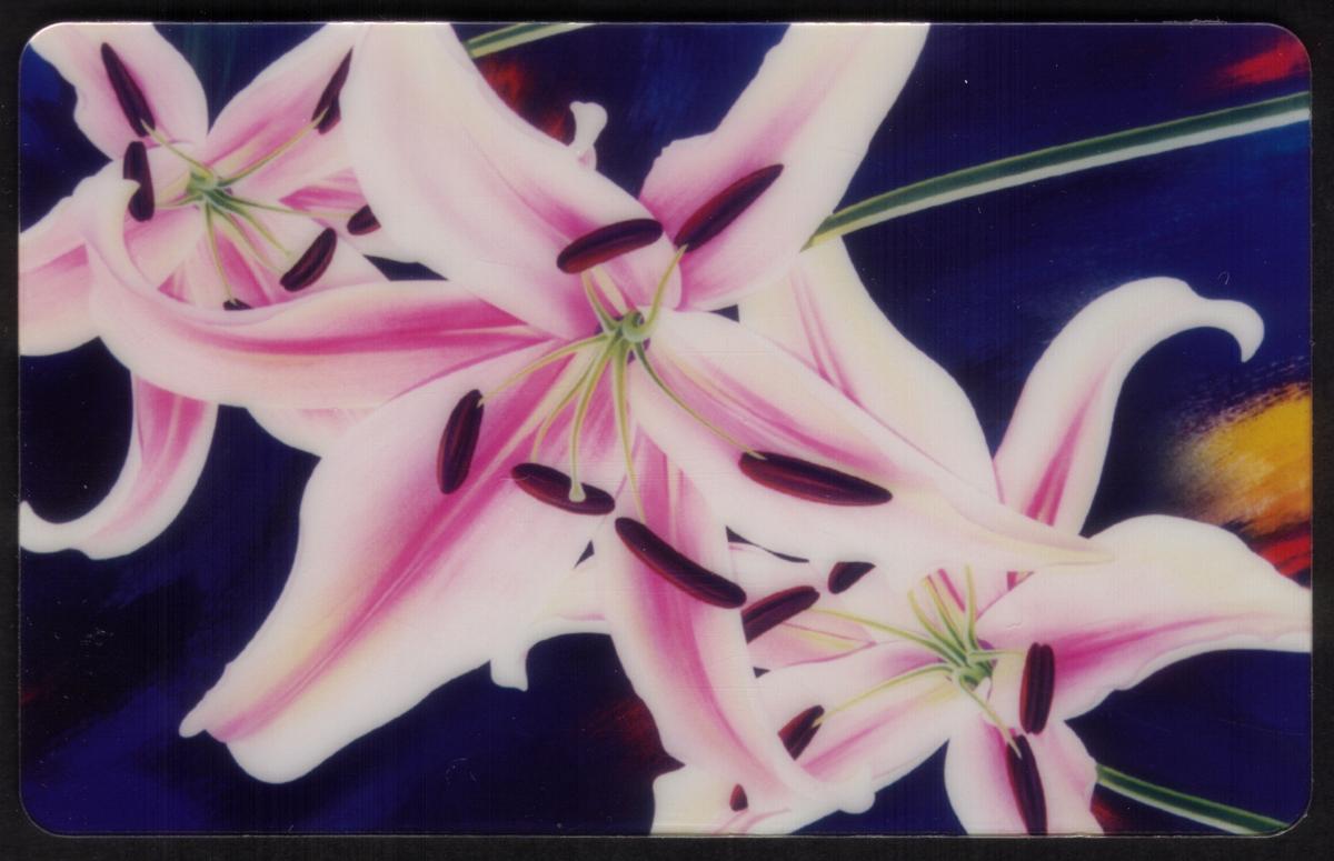 The third card depicts a collection of pink lilies with prominently detailed petals. The petals are shaded with soft pink tones and have dark stamens, set against a rich dark blue and purple background with hints of yellow, adding contrast and depth to the floral illustration.