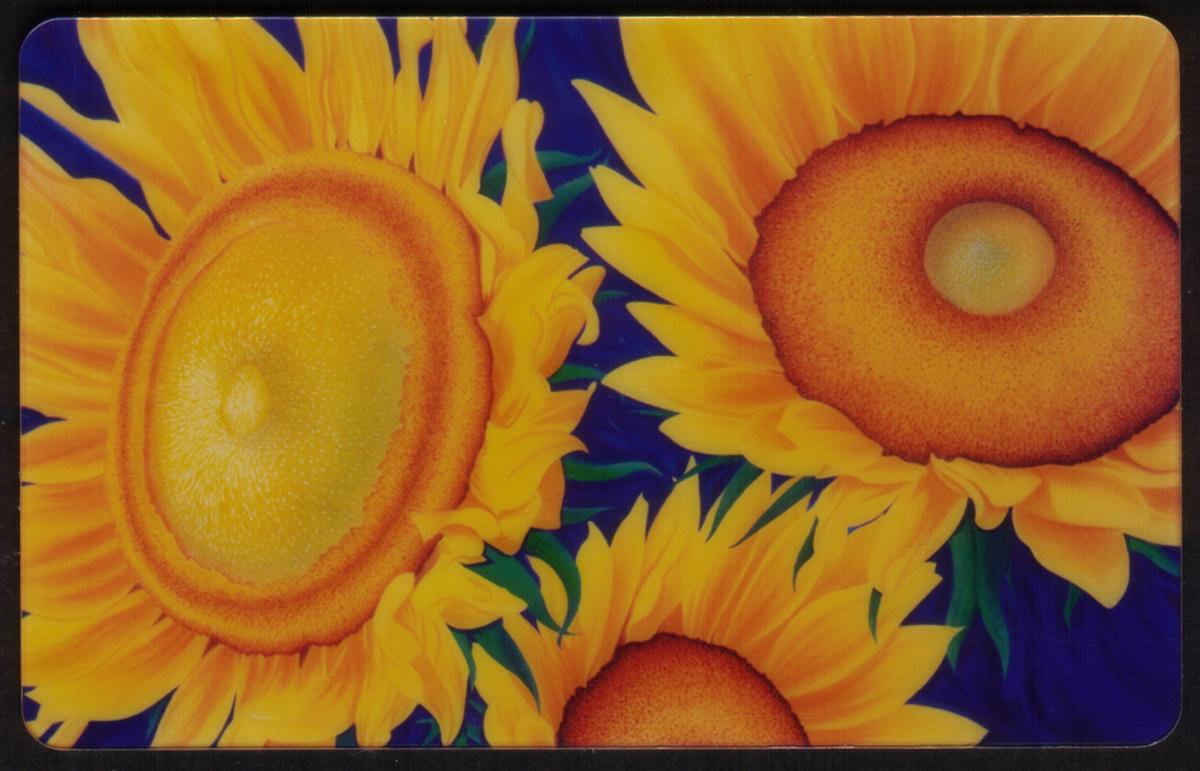 The fourth card features a vibrant grouping of sunflowers. The sunflowers exhibit bright yellow petals with a rich, layered texture and varying shades of orange and brown centers. The blue background helps the sunflowers stand out vividly, highlighting their warm and sunny nature.