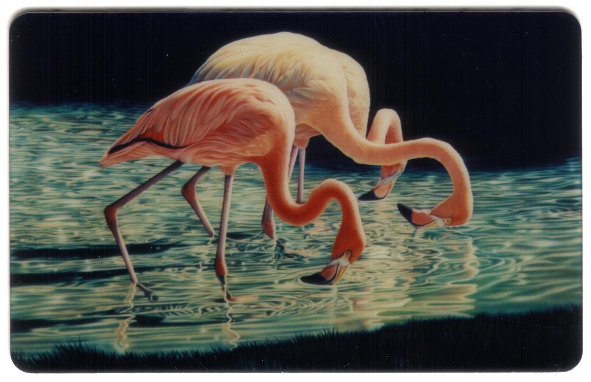 This collectible phone card features an artistic illustration of three flamingos standing in shallow water. The flamingos are depicted with their characteristic long necks curved downward as they feed, showcasing shades of pink and orange. The water surface reflects the birds and displays intricate ripples and highlights in blue and green tones. The background is dark, which emphasizes the bright colors of the flamingos and the water.