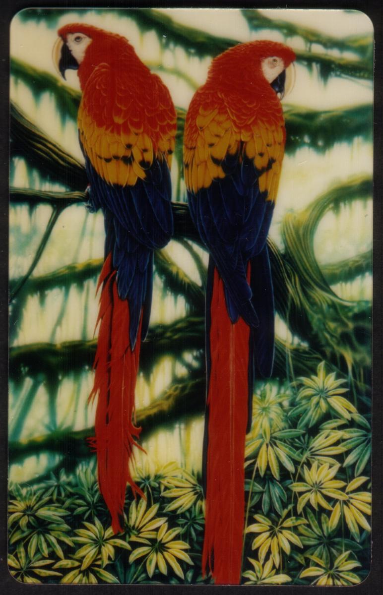 The overall presentation combines detailed, high-quality bird artwork with functional design elements for telecommunications. The inclusion of Larry Taugher’s art and the clear display of macaws make this card appealing to collectors interested in both phone card memorabilia and avian-themed art.
