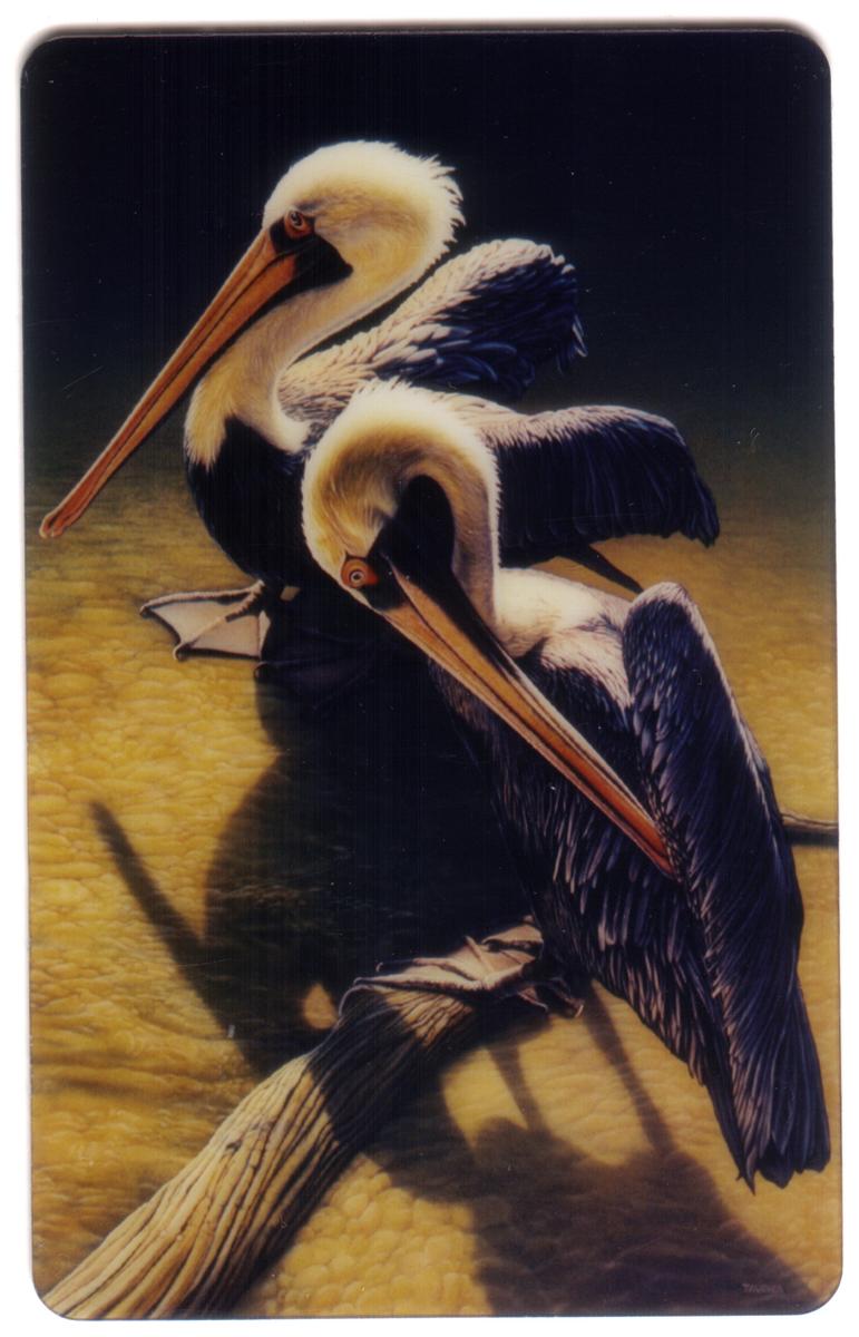 This collectible phone card features an artistic design of fifteen pelicans, created by Larry Taugher. The artwork showcases the pelicans in a naturalistic style, emphasizing their form and movement. The image carries a subtle, painted aesthetic typical of Larry Taugher’s work, with detailed attention to the birds’ plumage and poses.