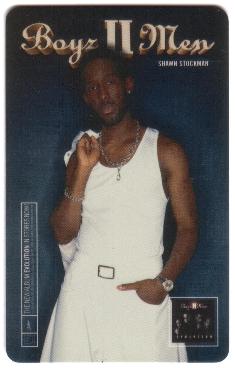 This collectible phone card features a photographic image of Boyz II Men, the renowned R&B vocal group. The card displays three members of the band, including Shawn Stockman, in a promotional pose related to their "Evolution" album. The men are dressed in dark clothing, standing against a neutral background that emphasizes their presence.