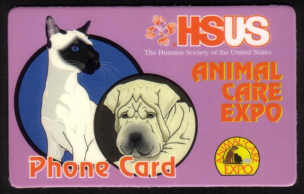 This collectible phone card features imagery related to the Humane Society of the United States (HSUS) Animal Care Expo held in 1995. The card prominently displays a diverse group of animals, including cats, dogs, and raccoons, representing common companions and wildlife cared for by HSUS initiatives. The design emphasizes the organization's focus on animal welfare and care.
