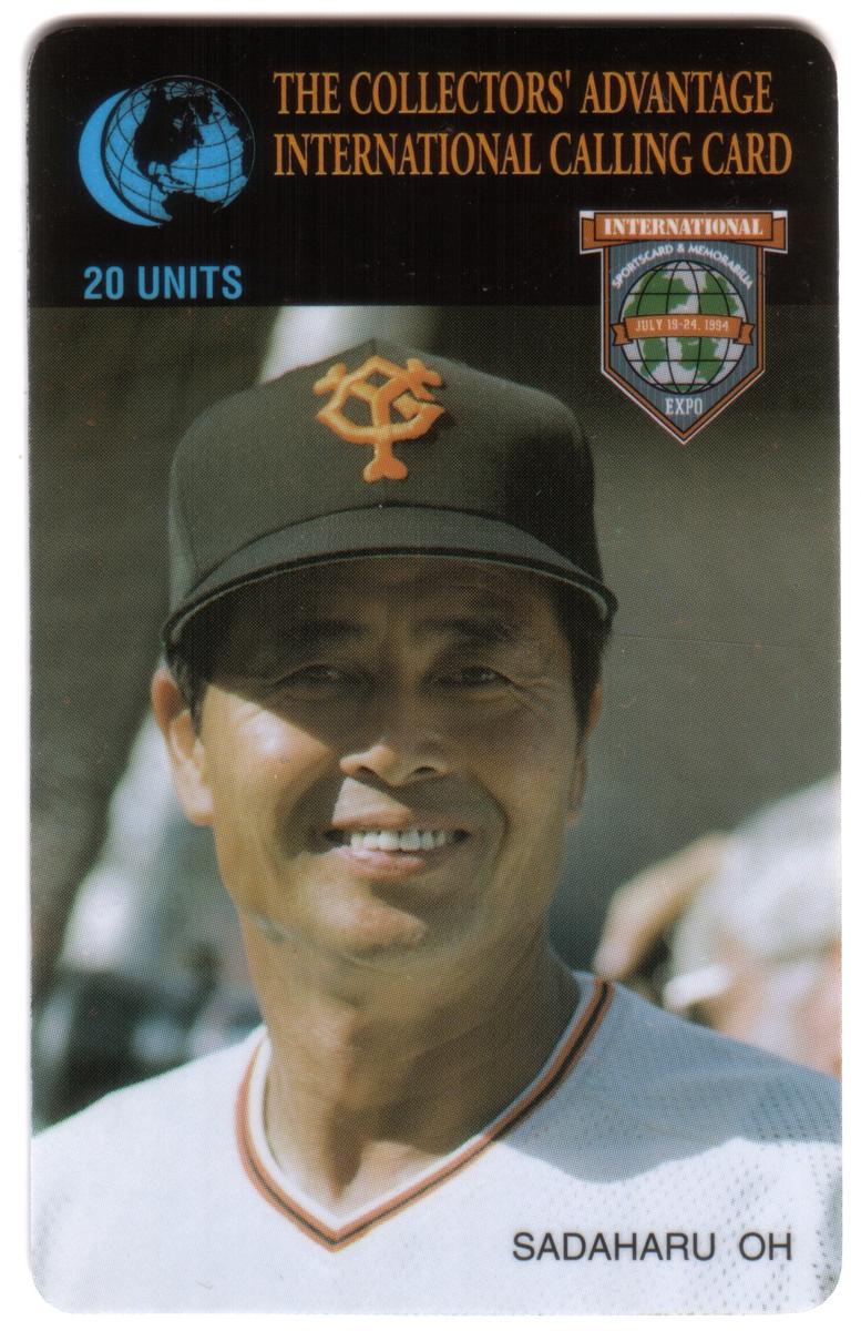 This collectible calling card features Sadaharu Oh, a renowned Japanese baseball star, depicted in a close-up photograph. He wears a black baseball cap with an orange interlocking "YG" logo, representing the Yomiuri Giants, and a white uniform with an orange and black collar trim. Sadaharu Oh is smiling, with a blurred background of spectators suggesting a baseball game setting.