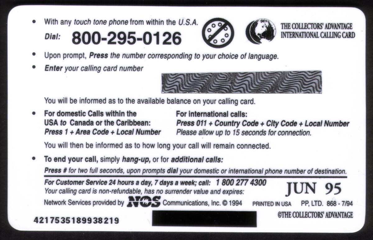 Since we have the world's largest inventory of USA phonecards for collectors, you will not necessarily receive the identical serial/batch/PIN number that we have scanned/pictured.