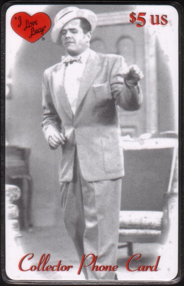 This collectible phone card features a colorful design centered around the classic television show "I Love Lucy." The card prominently showcases the characters Ricky Ricardo and Lucy Ricardo, portrayed respectively by Desi Arnaz and Lucille Ball. Ricky Ricardo is depicted wearing a distinct, black, curved mustache known as "The Moustache," a notable prop from the show. The image highlights Ricky in an expressive acting pose, capturing a memorable moment from the series.