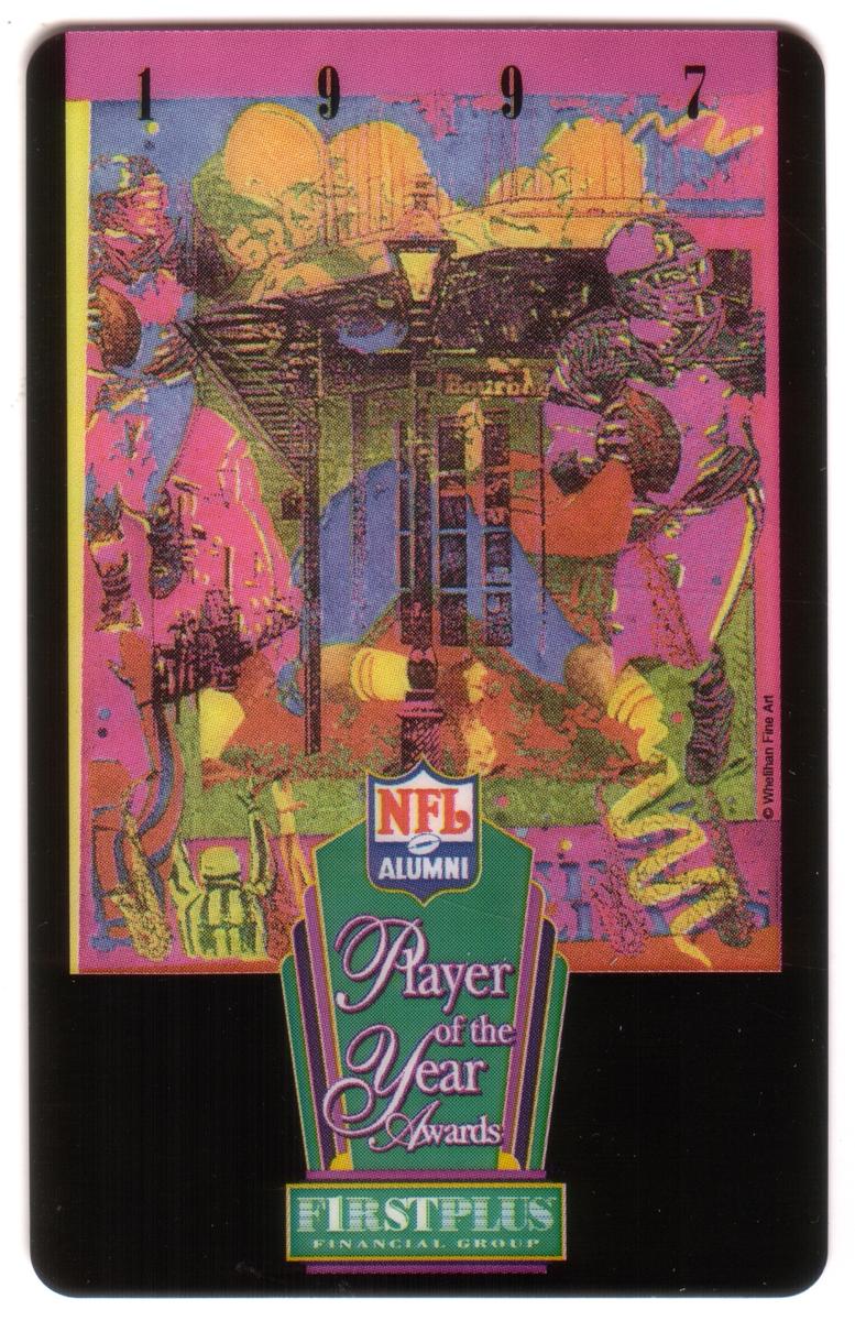 This collectible phone card from 1997 features artistic football imagery related to the NFL Alumni Player of the Year Awards. The card art depicts stylized football players in motion with vibrant colors including pink, green, and orange, creating a dynamic and abstract design.