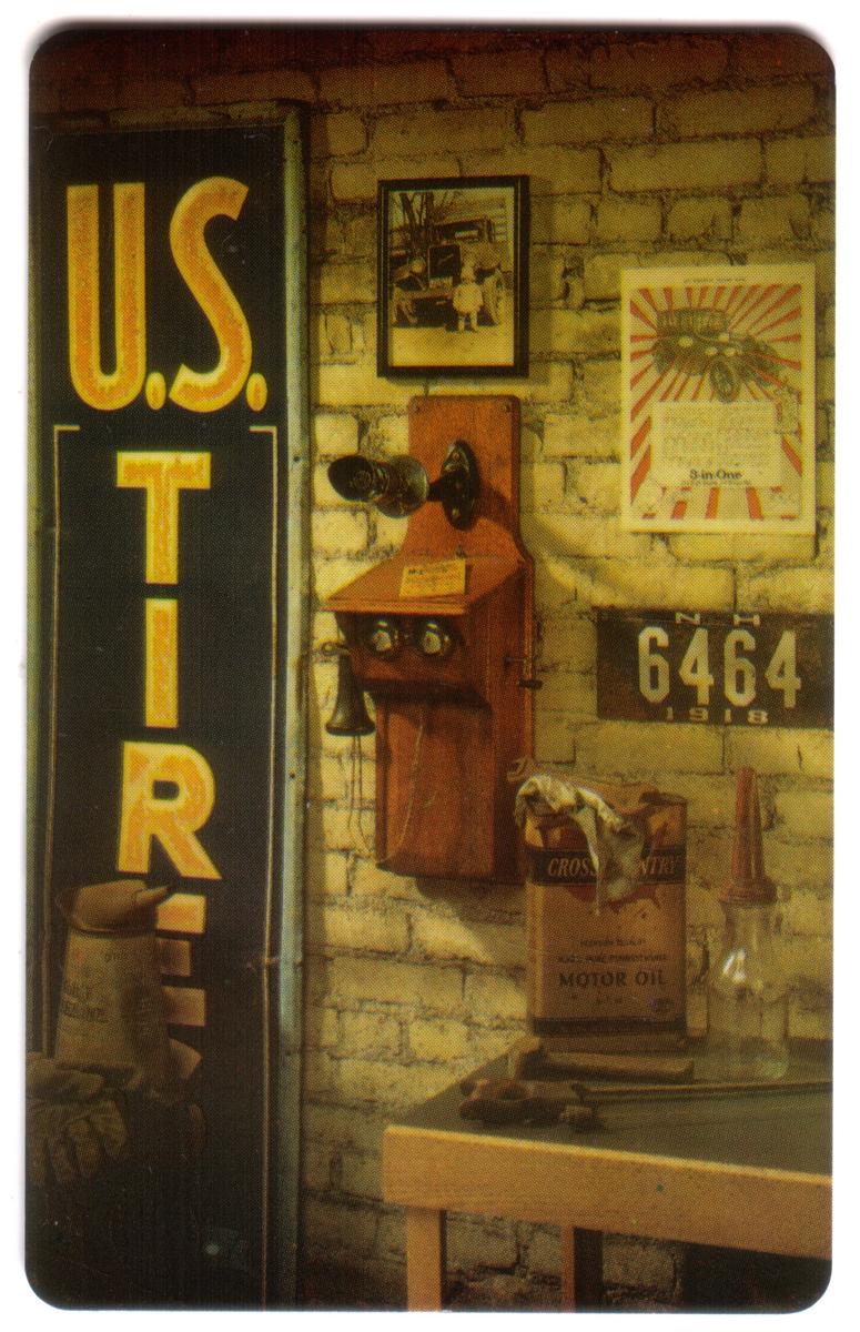 Additional logos and text on the card reference cable & wireless, Cross Country Motor Oil, and C&W, emphasizing connections to telecommunications companies and related promotional partnerships. The inclusion of children and antique automobiles in the keywords reflects the card’s nostalgic appeal, linking phone technology with historical Americana and vintage culture.