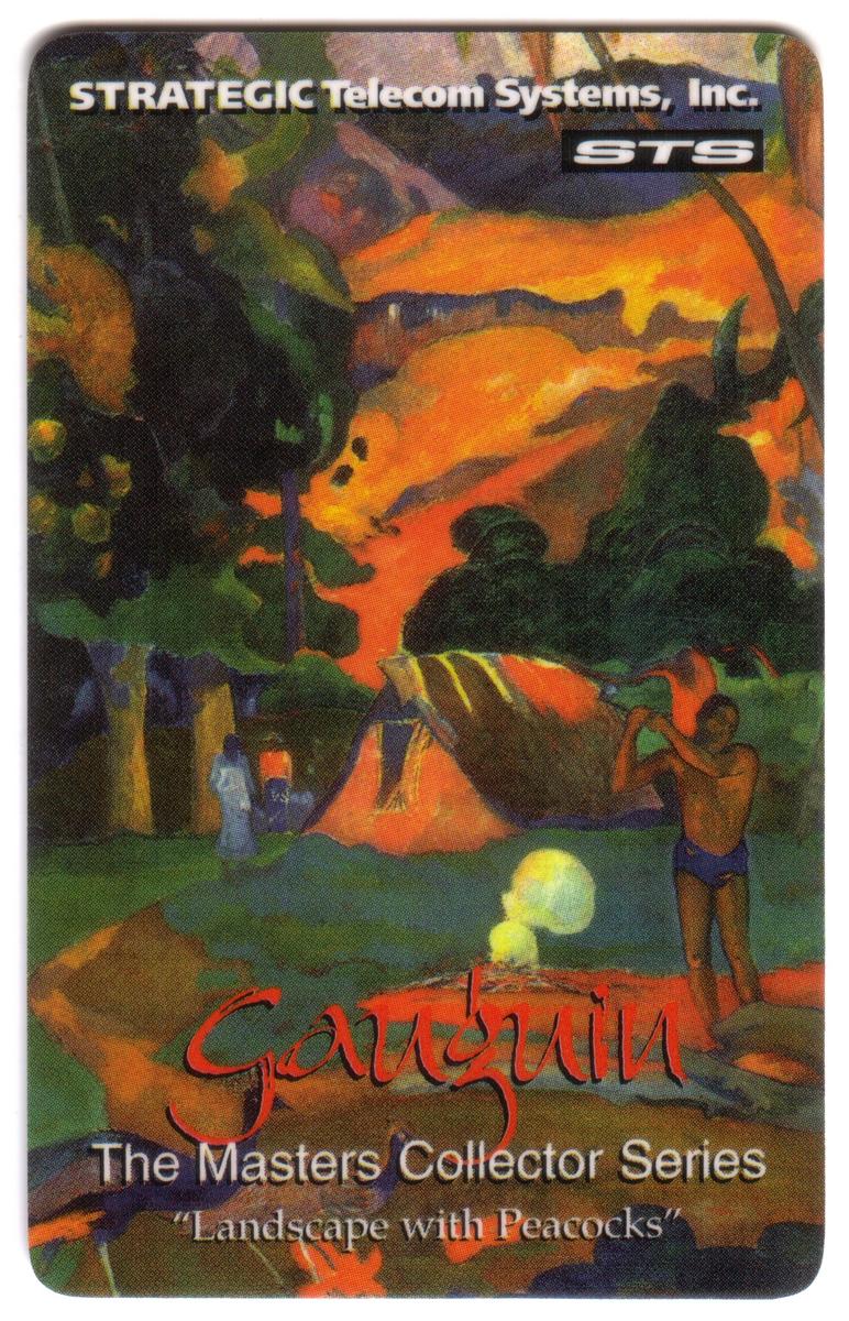 The third card portrays "Landscape with Peacocks," showing an outdoor scene at sunset with dramatic orange and yellow sky hues. A person is holding a large cloth or sail near trees and peacocks in the foreground, capturing a tropical setting. All cards include the "Strategic Telecom Systems, Inc." and "STS" logos at the top, the red "Gauguin" signature in the center, and the series name "The Masters Collector Series" at the bottom, with the individual painting titles in quotation marks.