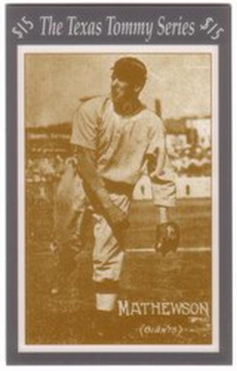 This collectible card features baseball legend Christy Mathewson, also known as "Texas Tommy," who played for the New York Giants. The card is part of the Texas Tommy Baseball Series and highlights Mathewson as "The Christian Gentleman" and "Big Six," nicknames associated with his esteemed baseball career. The image prominently displays Christy Mathewson in his Giants uniform, emphasizing his connection to Major League Baseball (MLB).