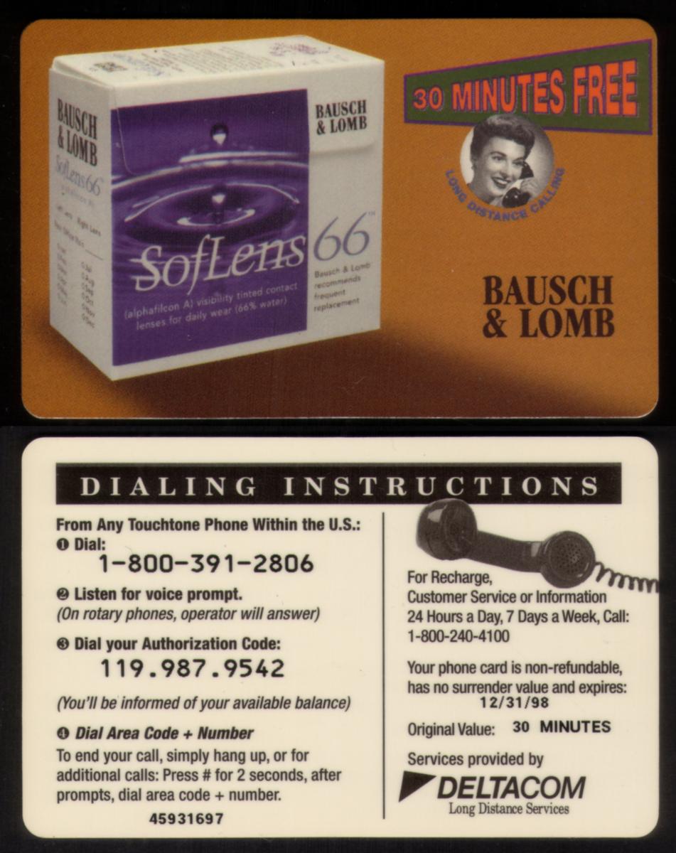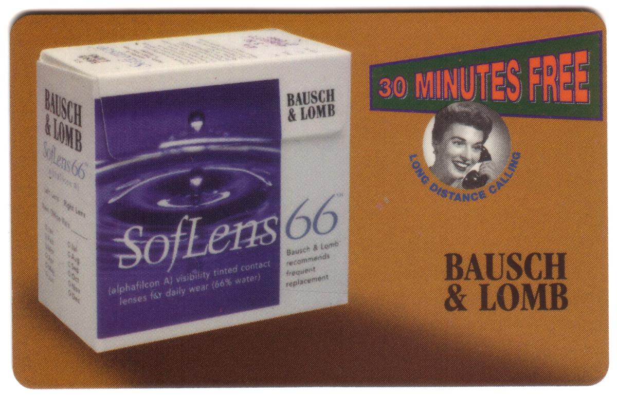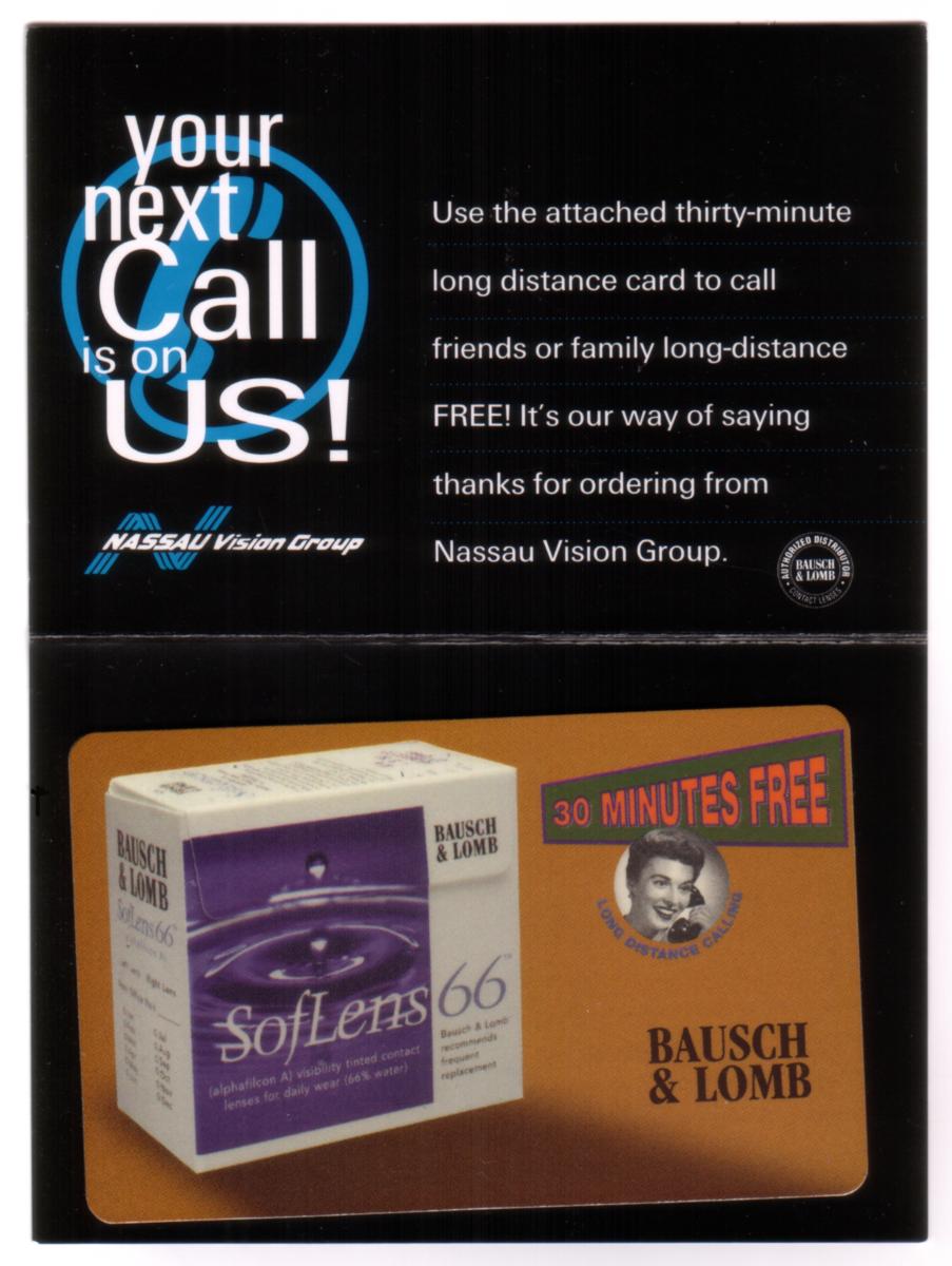 Overall, this promotional phone card highlights Bausch & Lomb’s SofLens 66 soft toric lenses aimed at customers needing astigmatism correction, while promoting Nassau Vision Group. It serves both as a prepaid phone card with a 30-minute credit and as an advertising medium for specialized eye care products.