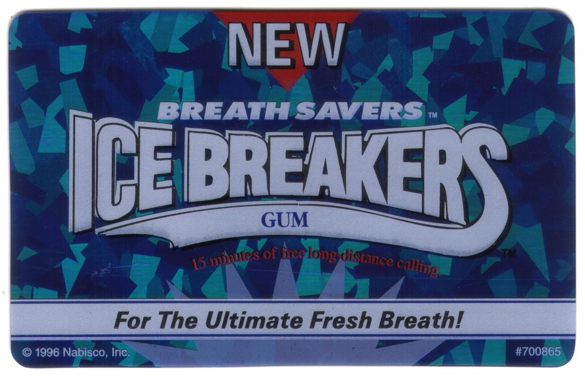 This collectible corporate promotional card from 1996 features branding for Breath Savers Ice Breakers Gum. The main design element is the bold, large text "ICE BREAKERS" with "BREATH SAVERS" in smaller letters above and "GUM" centered below. Across the middle, there is a red text tagline that reads "15 minutes of free long distance calling." At the bottom, a white banner displays the phrase "For The Ultimate Fresh Breath!" The background consists of a mosaic-like pattern with various shades of blue and green, creating a shimmering, glitter effect.