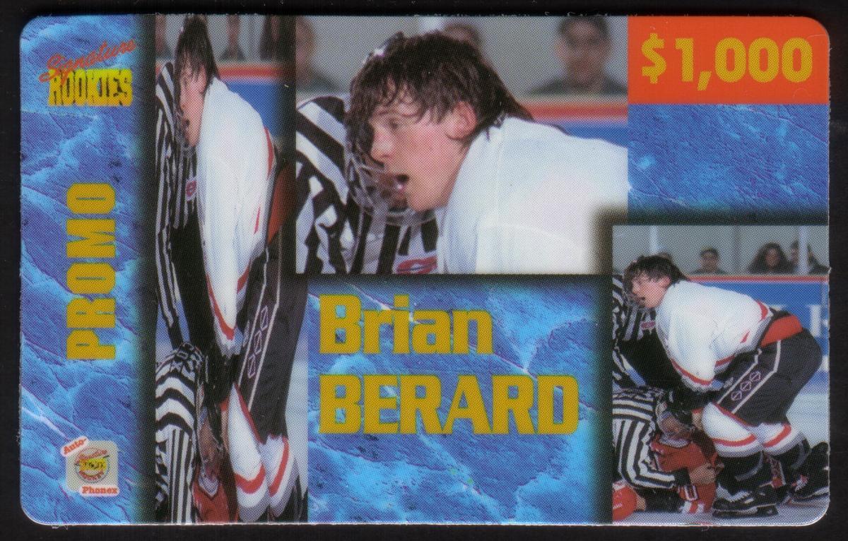 This collectible phone card features prominent ice hockey player Bryan Berard. The card highlights Berard as part of the "Auto-Phonex Signature Rookies" series, emphasizing his role in hockey. Bryan Berard is depicted in full hockey gear, poised in action on the ice, wearing a white and green hockey jersey. The background includes a stylized green and blue design with vertical elements that resemble goal netting or ice rink patterns.