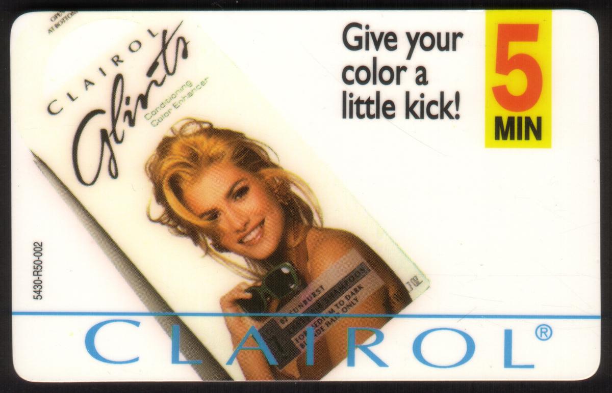 This collectible promotional phone card features branding for Clairol Glints Hair Color, specifically highlighting the "Sunburst" shade intended for medium to dark blonde hair. The card prominently displays the Clairol logo along with product details such as "conditioning color enhancer" and the phrase "give your color a little kick." The design emphasizes the hair color product’s purpose as a vibrant enhancer with the sunburst color theme.