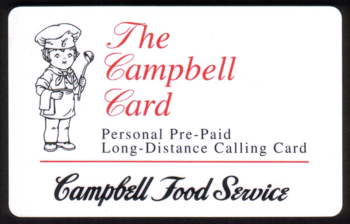 The text on the card is presented in three distinct styles and colors. At the top right, in red cursive script, are the words "The Campbell Card." Below this, in black, plain serif font, are the words "Personal Pre-Paid Long-Distance Calling Card," with a thin red line underneath. At the bottom of the card, "Campbell Food Service" is written in an elegant black script font.