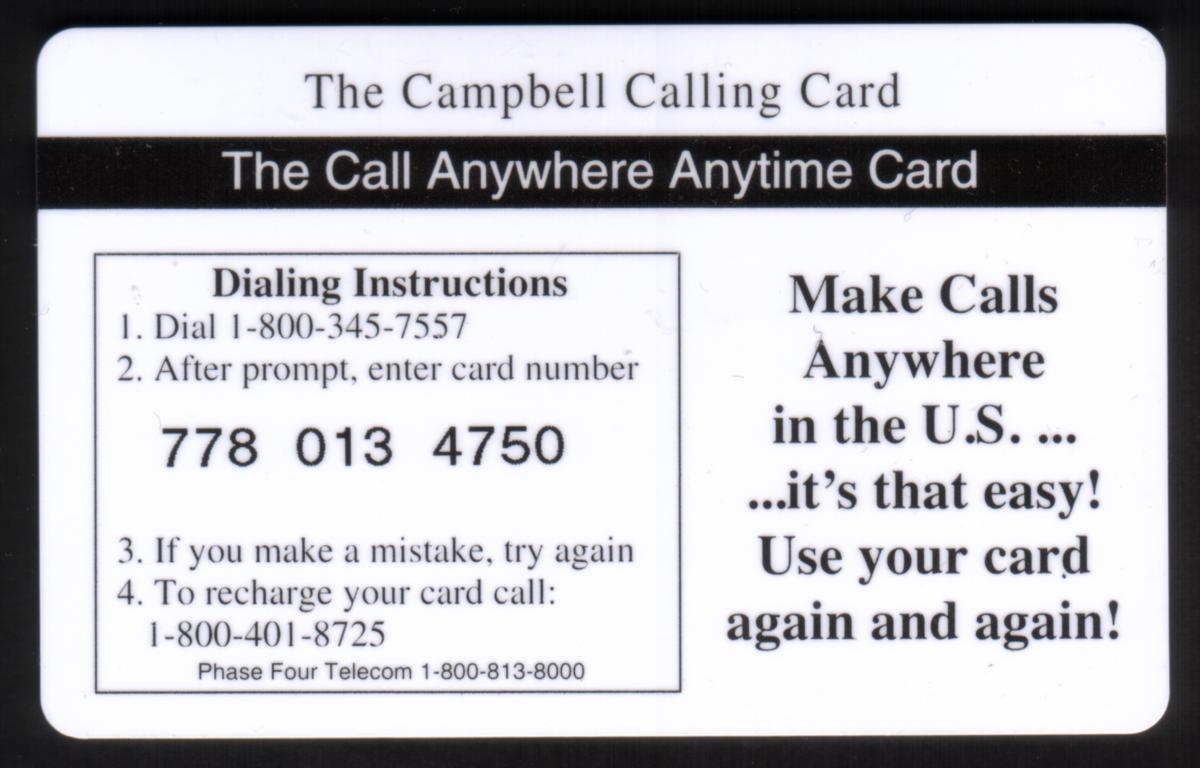 This phone card is a promotional product associated with Campbell's Soup, specifically linked to Campbell Food Service. It is connected to Phase Four Interactive and Phase Four Telecom, as indicated by the keywords. The card design is clean and focused on branding, with a white background and no additional decoration or imagery.