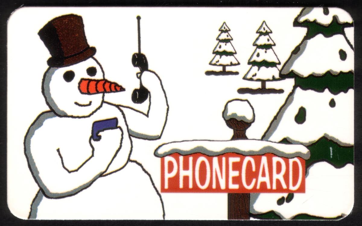 The design blends elements of telecommunication and winter imagery, highlighting innovative telecom themes with telephones on phone cards and snow motifs. The snowman with the top hat and the snowy trees create a festive and seasonal atmosphere for this collectible item.