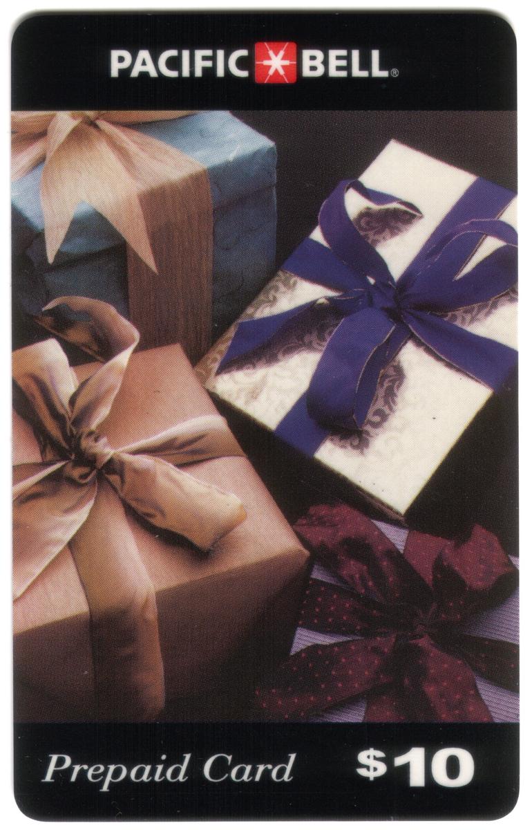 This card is part of a series from 1995 focused on the holidays, making it suitable for collectors interested in seasonal themes or vintage phone cards associated with Pacific Bell. The emphasis on ribbons, bows, and present wrapping makes it a distinctive representation of Christmas gifts, catering to those who collect items that commemorate holiday traditions.