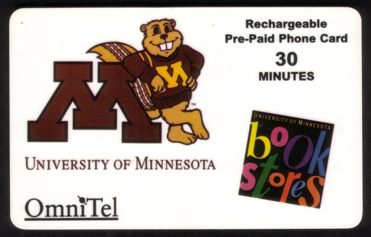 This card is issued by OmniTel and classifies as a collectible phone card. It is part of a series connected to promotional items involving colleges and universities, specifically featuring animals as mascots along with educational themes tied to book stores. The overall layout presents a clear and factual representation of the University of Minnesota Book Stores alongside the university’s iconic mascot.