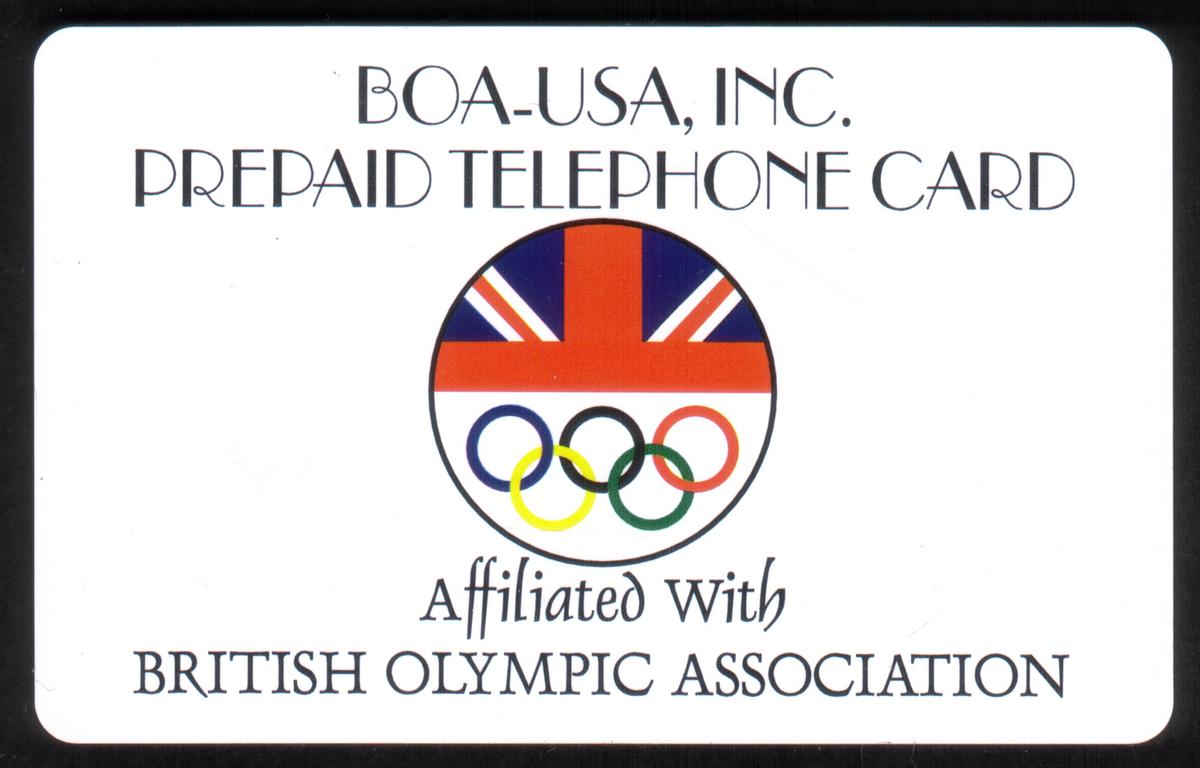 This prepaid telephone card is issued by BOA-USA, Inc. and prominently features the logo combining the British flag and the Olympic rings. The card is affiliated with the British Olympic Association, as explicitly stated in the text. The layout includes the label "PREPAID TELEPHONE CARD" centered at the top, and the phrase "Affiliated With BRITISH OLYMPIC ASSOCIATION" below the logo. The design uses black text on a white background, creating a clean and clear presentation focused on the Olympic theme and British connection.