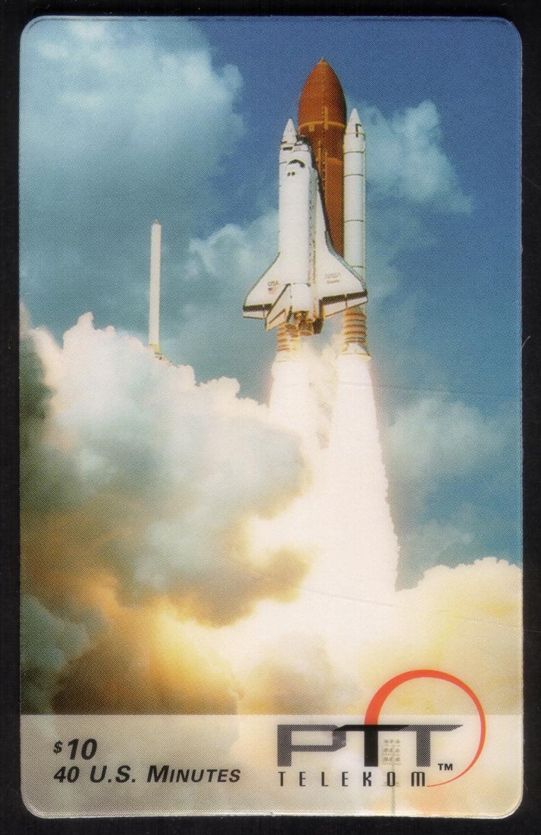Text on the card includes the denomination "$10. (40m)" indicating the card’s value and usage time. The issuing entity "PTT Telekom" is displayed, linking it to telecommunication services. The card commemorates NASA and its space programs, highlighting themes such as space exploration, aerospace engineering, and Americana. The name “Kennedy Space Center” is implied through references to KSC and the imagery of the shuttle launch, which is an iconic feature of Florida attractions and sightseeing related to outer space travel.